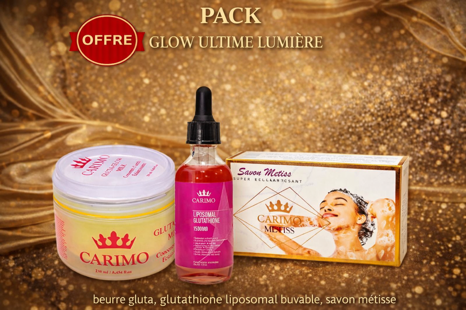 Ce pack contient beurre gluta glow, Glutathione liposomal (buvable) et le savon métisse